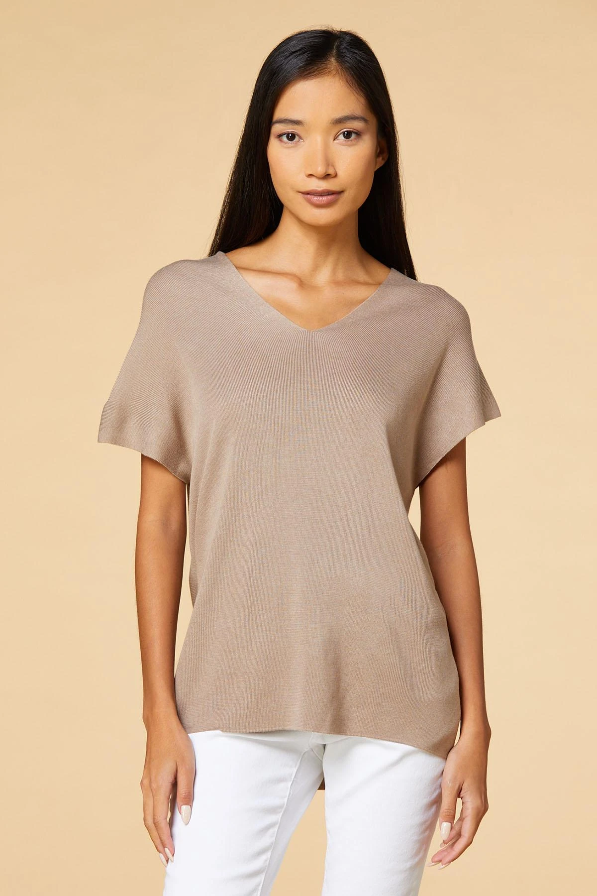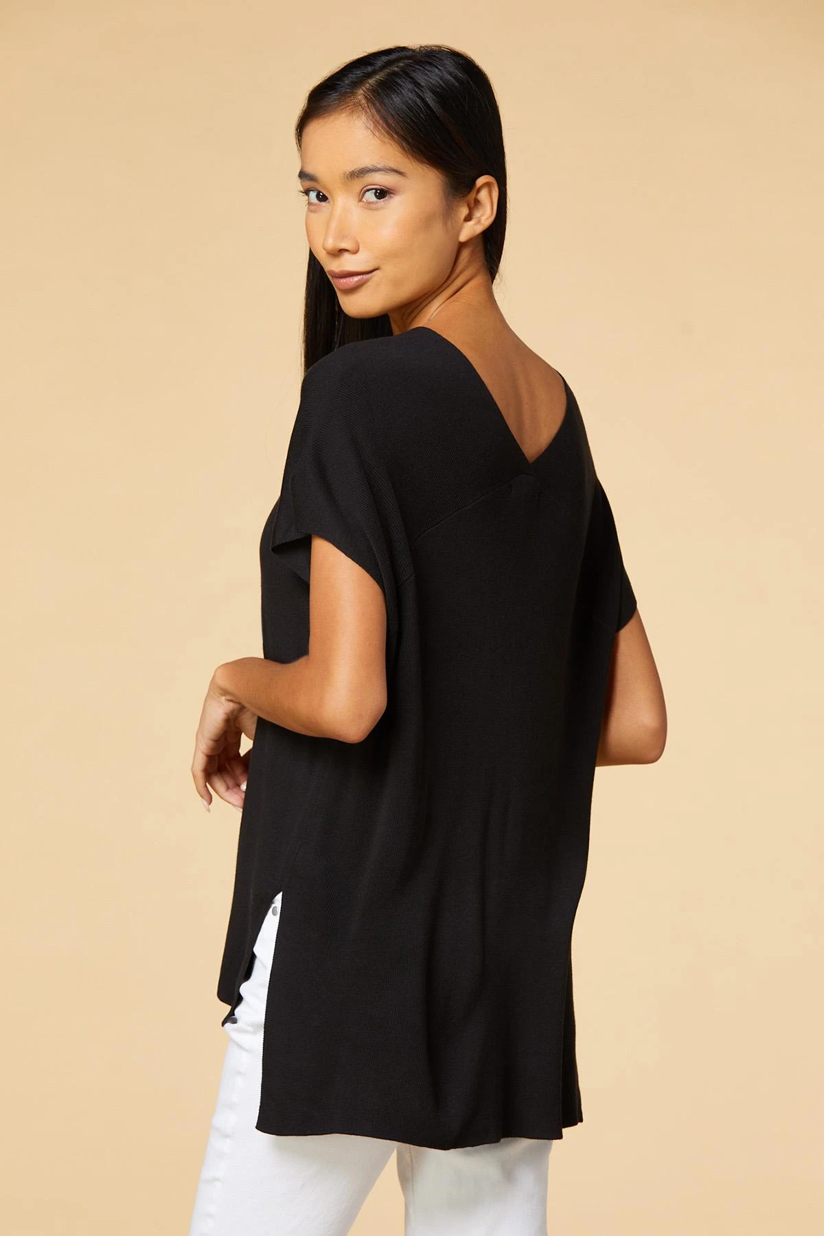 A short sleeve sweater stunner. A v-neckline, drop shoulder and slit hem create a style you’ll love in any weather.