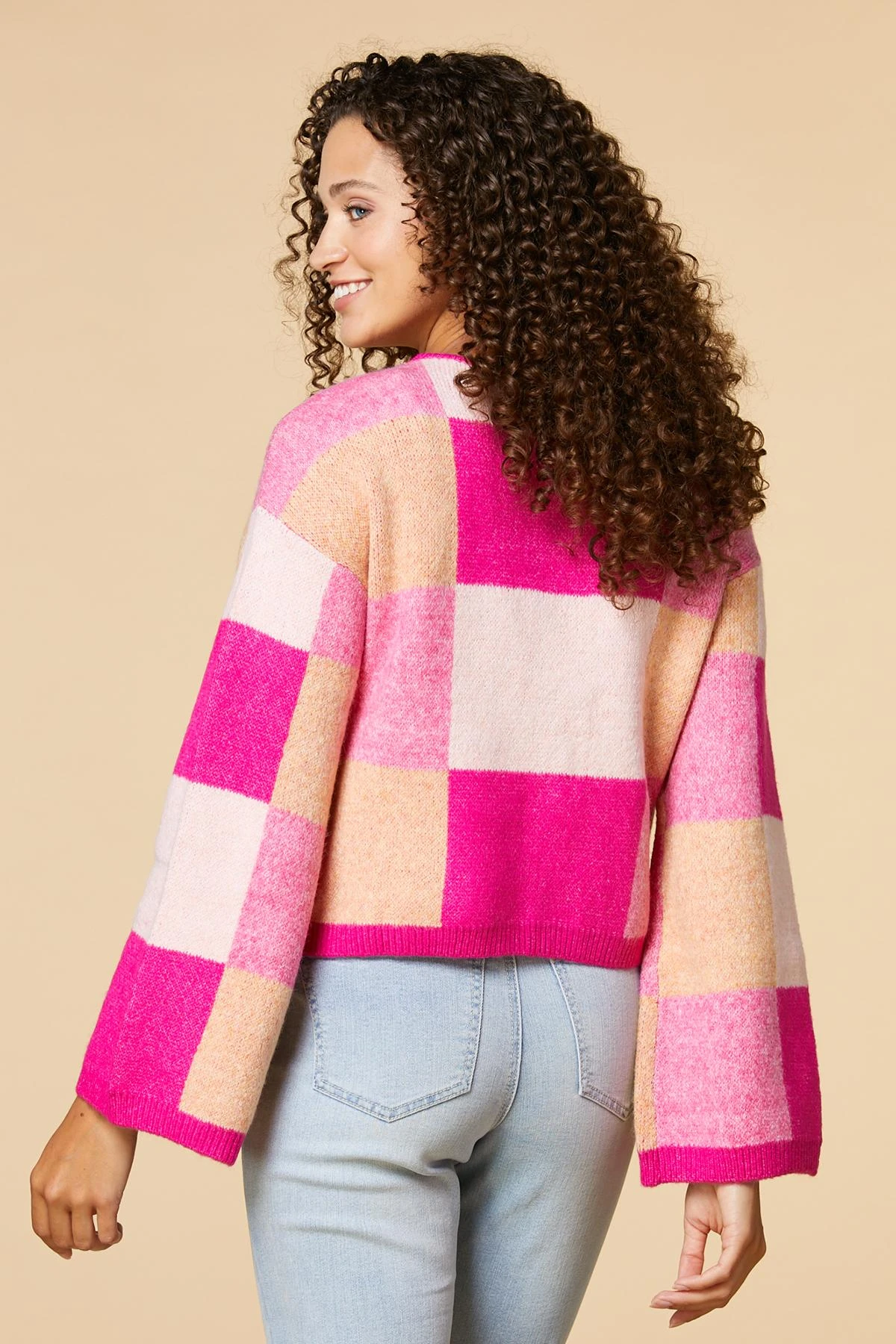 You’re like, really pretty in this cardi. A v-neckline and bell sleeves create a flirty-fun shape that’s finished with a pretty pink-orange colorblock print. Wear with our so fetch tank for a totally 2000s fit.