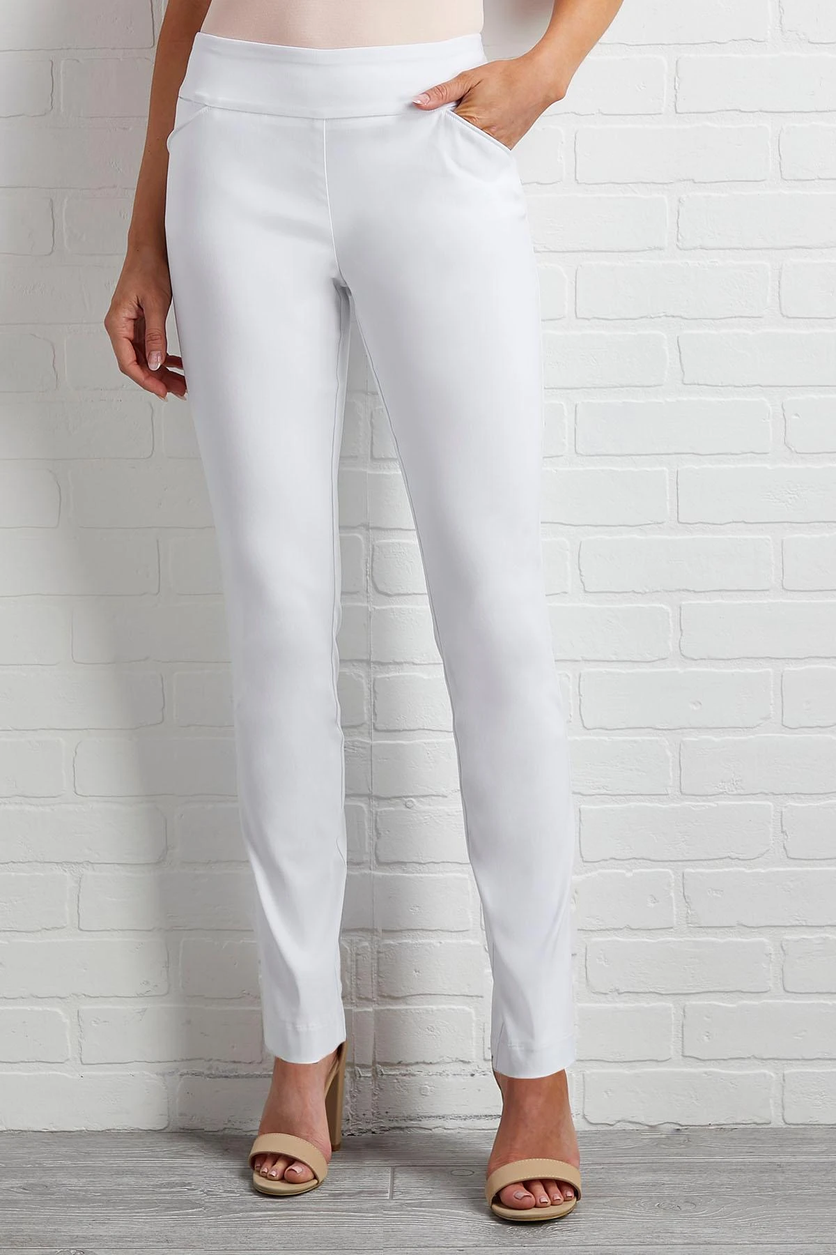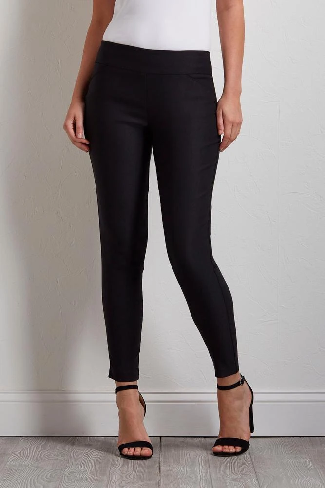 These tried and true bengaline pants are a wardrobe must-have with its solid color and comfortable pull-on waist. 28″ inseam.