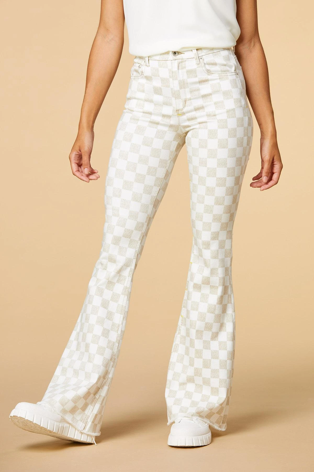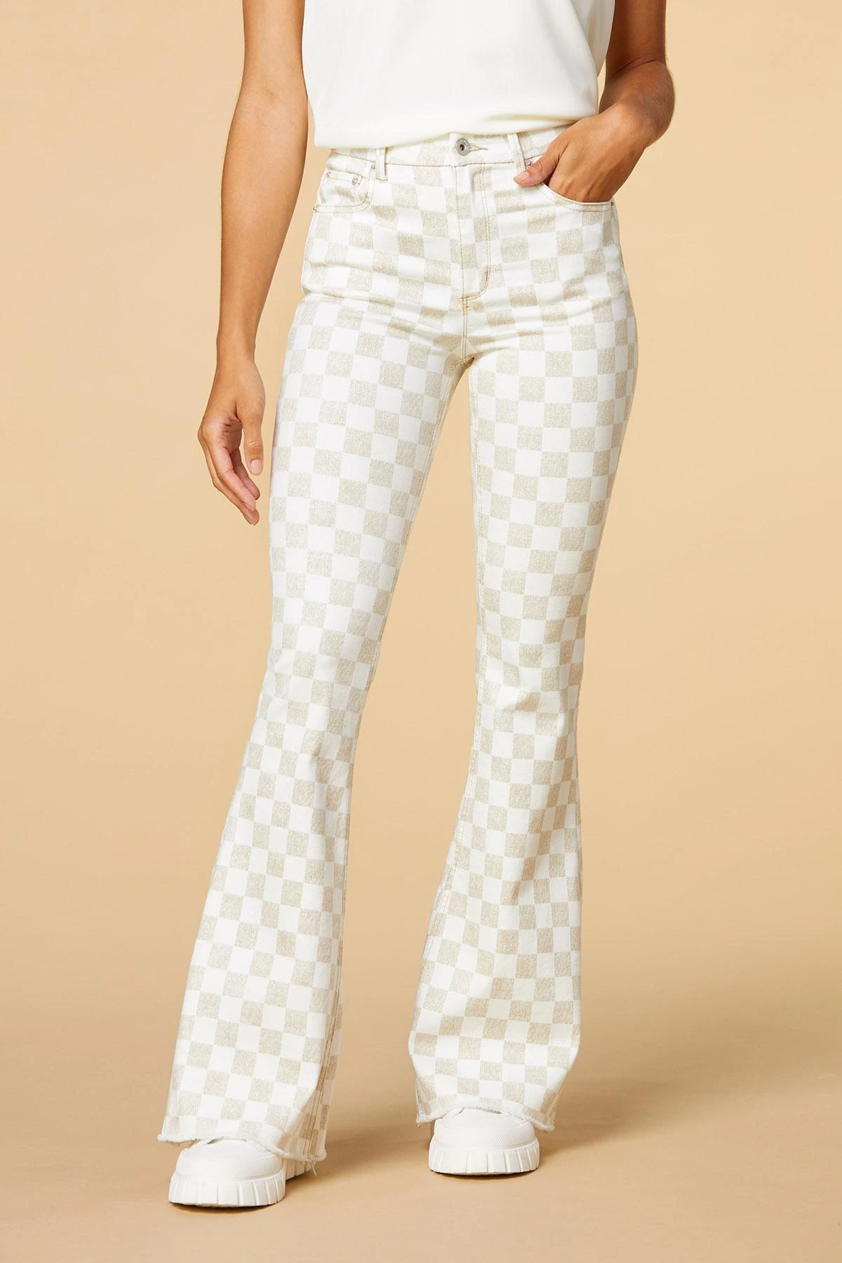 Get ready, get set and go with these super cute check print flares! They’re equally cozy and cute with a light and stretchy feel, a high waist and frayed super flare hem.