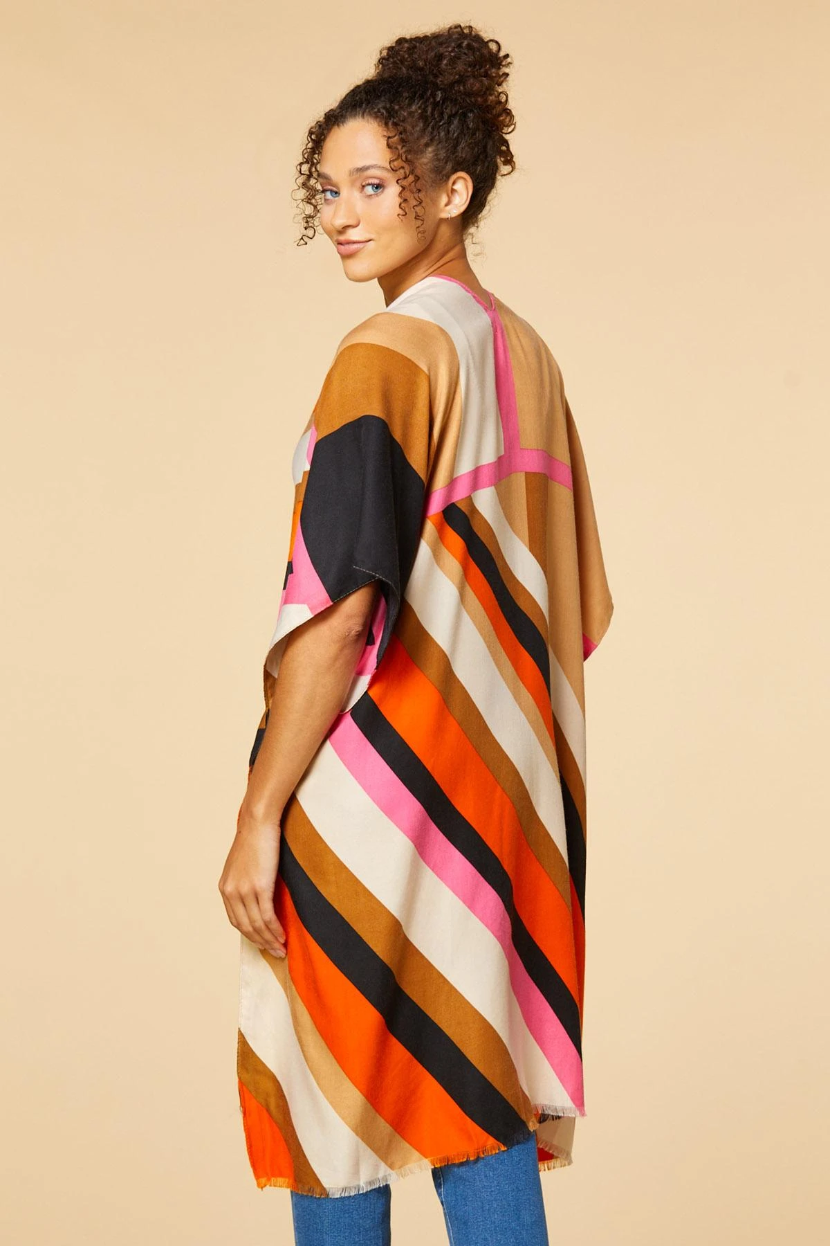 Get ready for your close up. This kimono is a uniquely lovely style with a multicolor stripe print that gives an abstract feel.