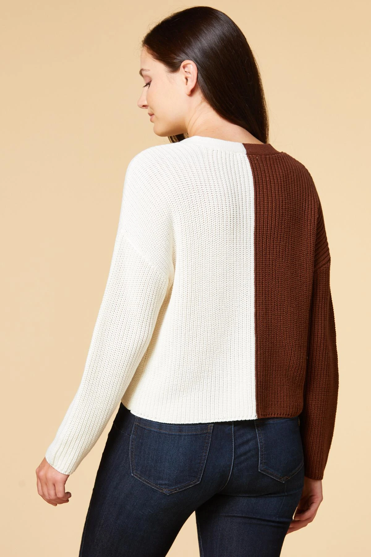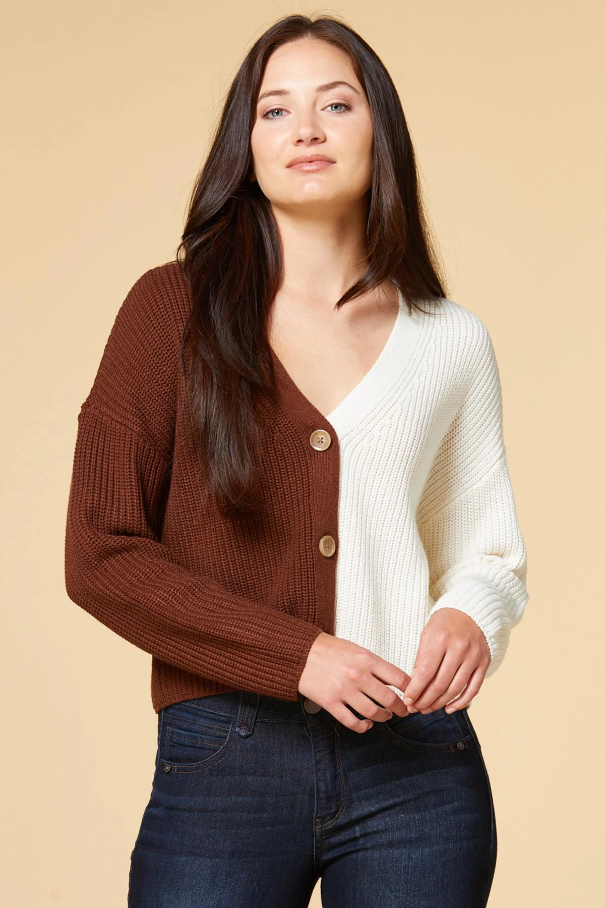 It sure is nice. This contrasting cardi is equal parts cute and bold with boxy stitching, a color block print and a button-down front, because everyone knows opposites attract.