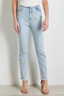 Your favorite basic is blossoming with embroidered-sunflowers, a frayed waist, frayed hem and stretchy, straight-leg silhouette.