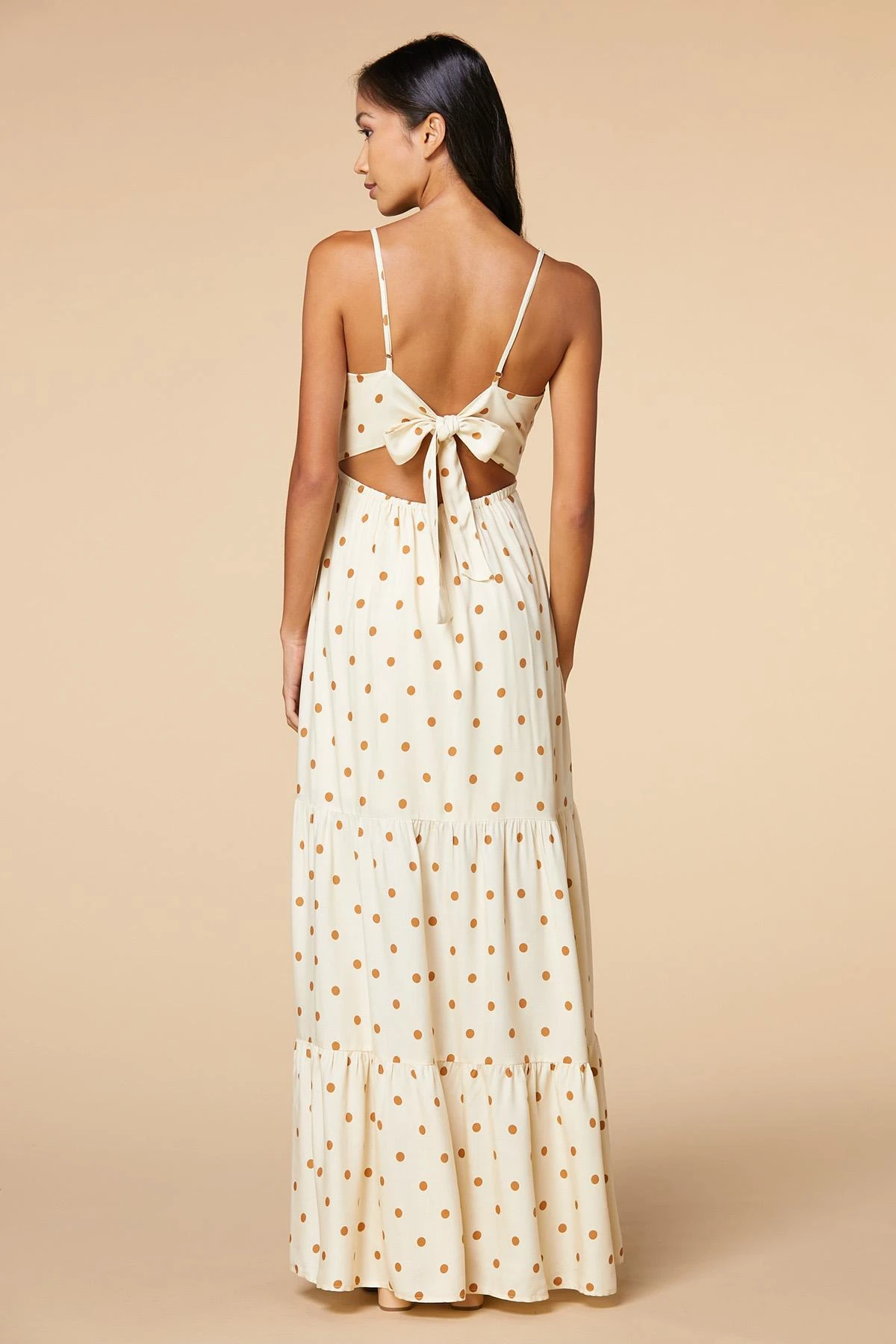 Look absolutely darling in this light and lovely look with a v-neckline, tiered design and tie-cutout back. A polka dotted print and contrasting, color palette seals-the-deal as a soon-to-be sunshine-ready favorite.
