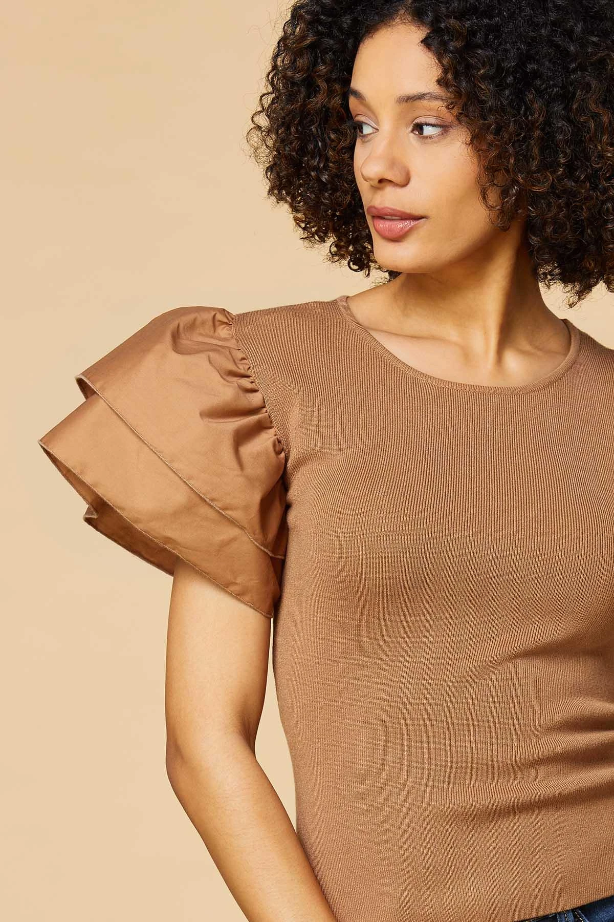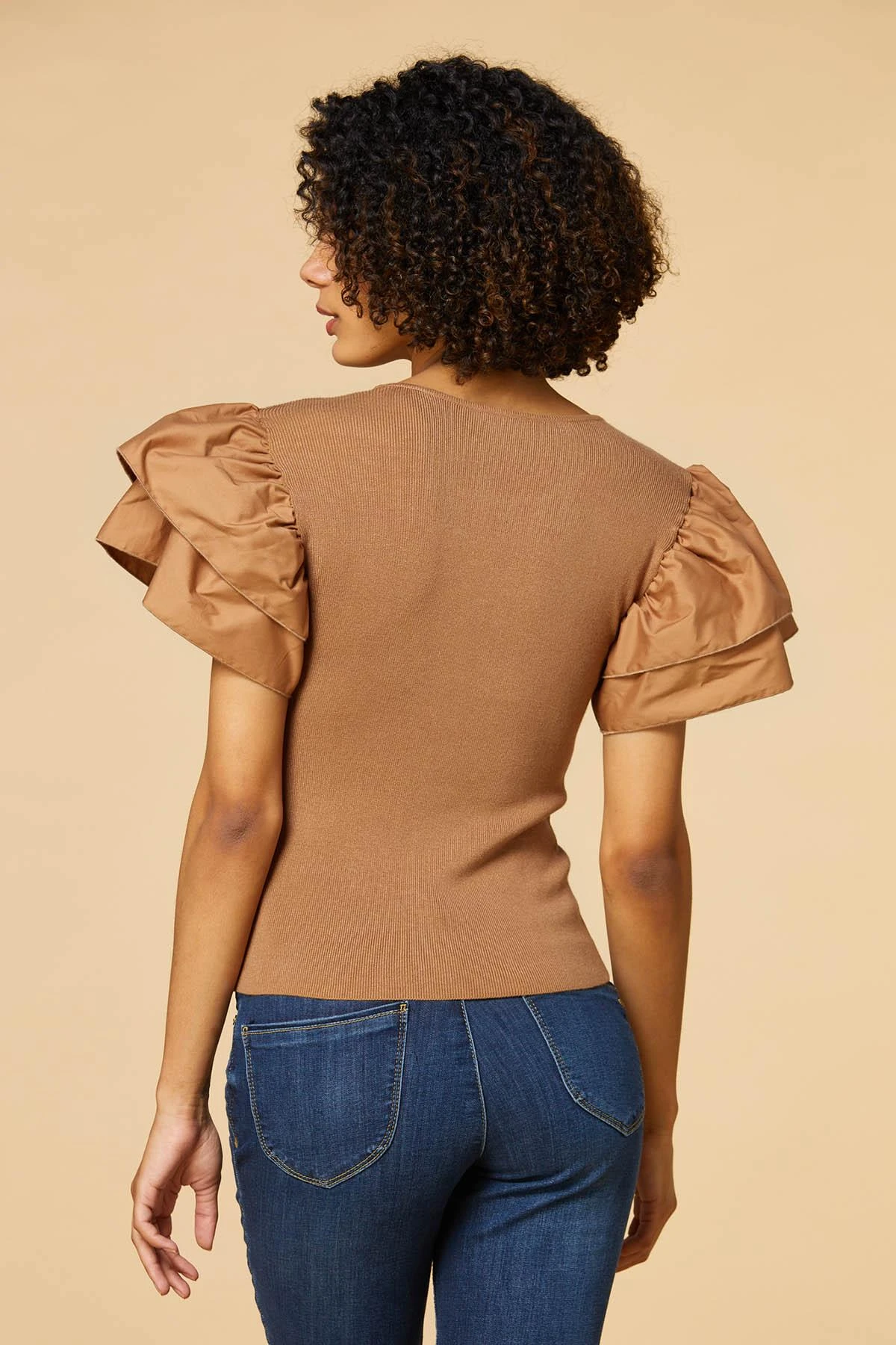 If you can’t decide on one, pick this happy medium. Mixed fabrication is key in this top with a sweater body and tiered cotton sleeves.