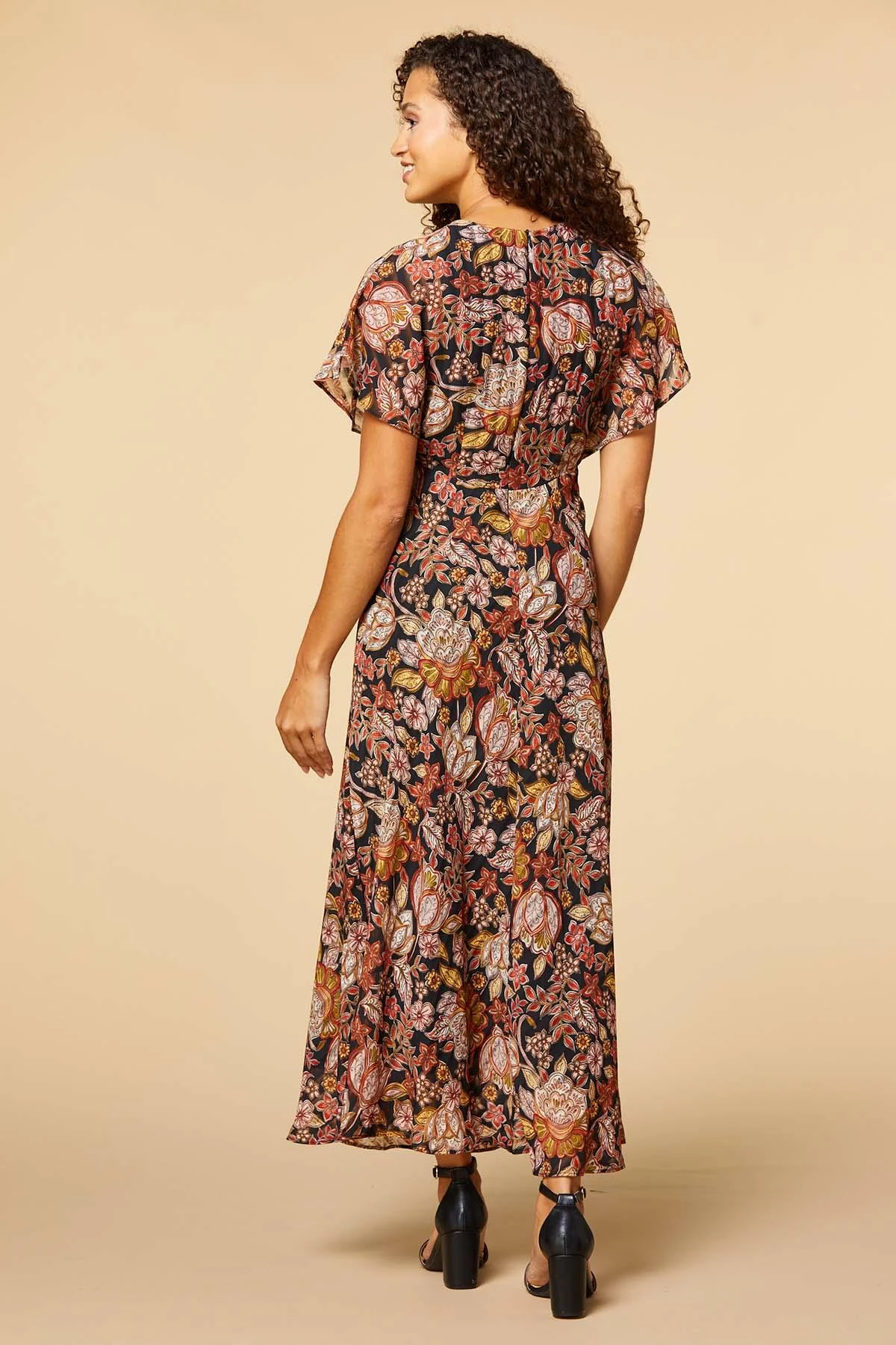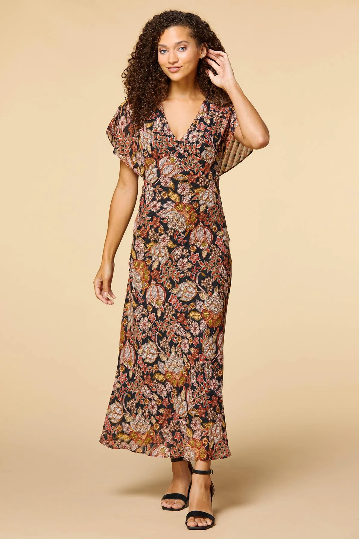 Keep things cool with this dress. A floral print with shadow stripes cover this midi dress that also features a v-neckline.