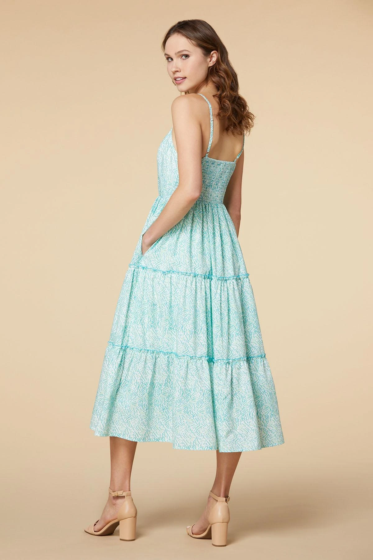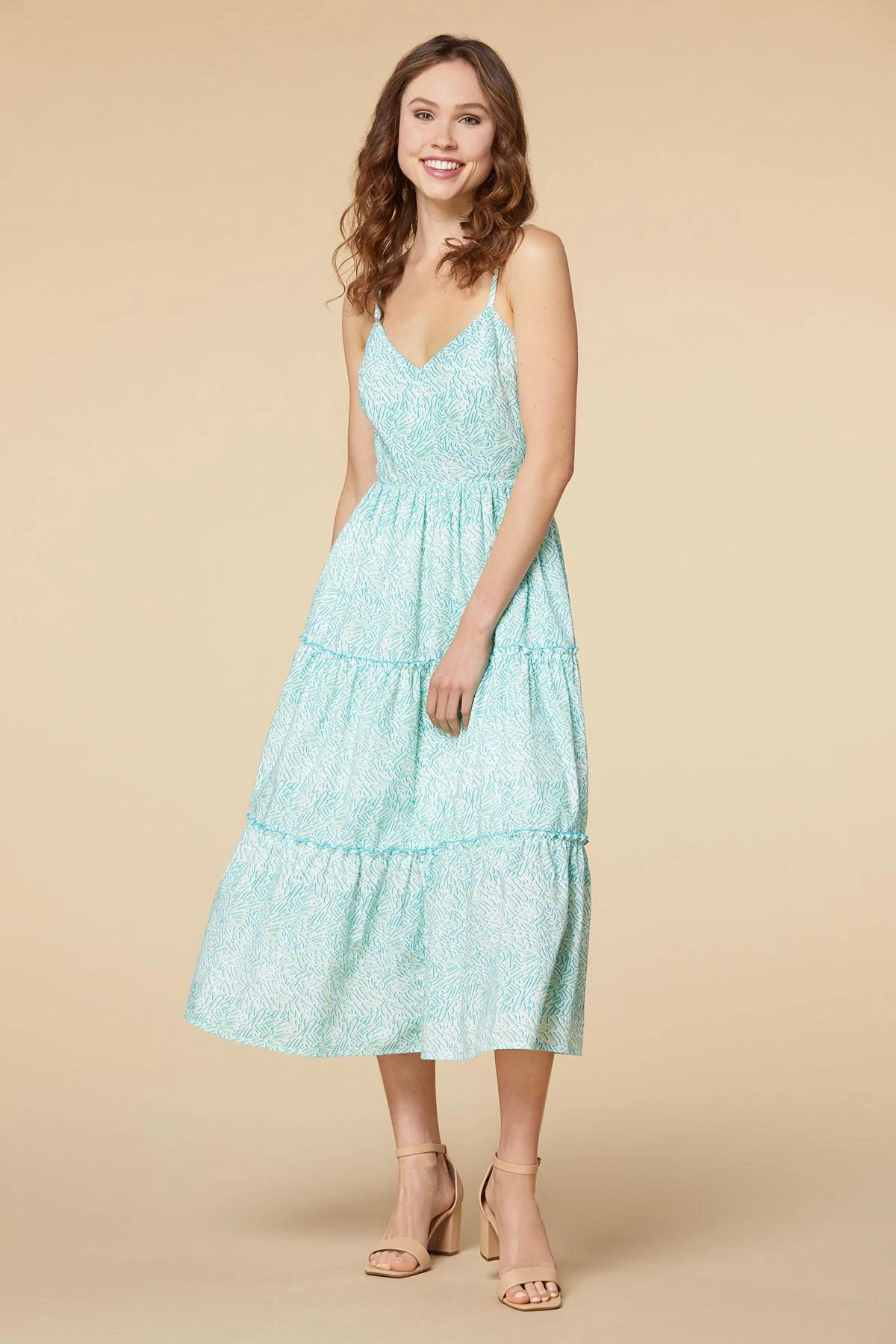 Simply charming is exactly what you get with the geo print, green and blue hues and ruffled-trim tiers of this breezy and beautiful style.