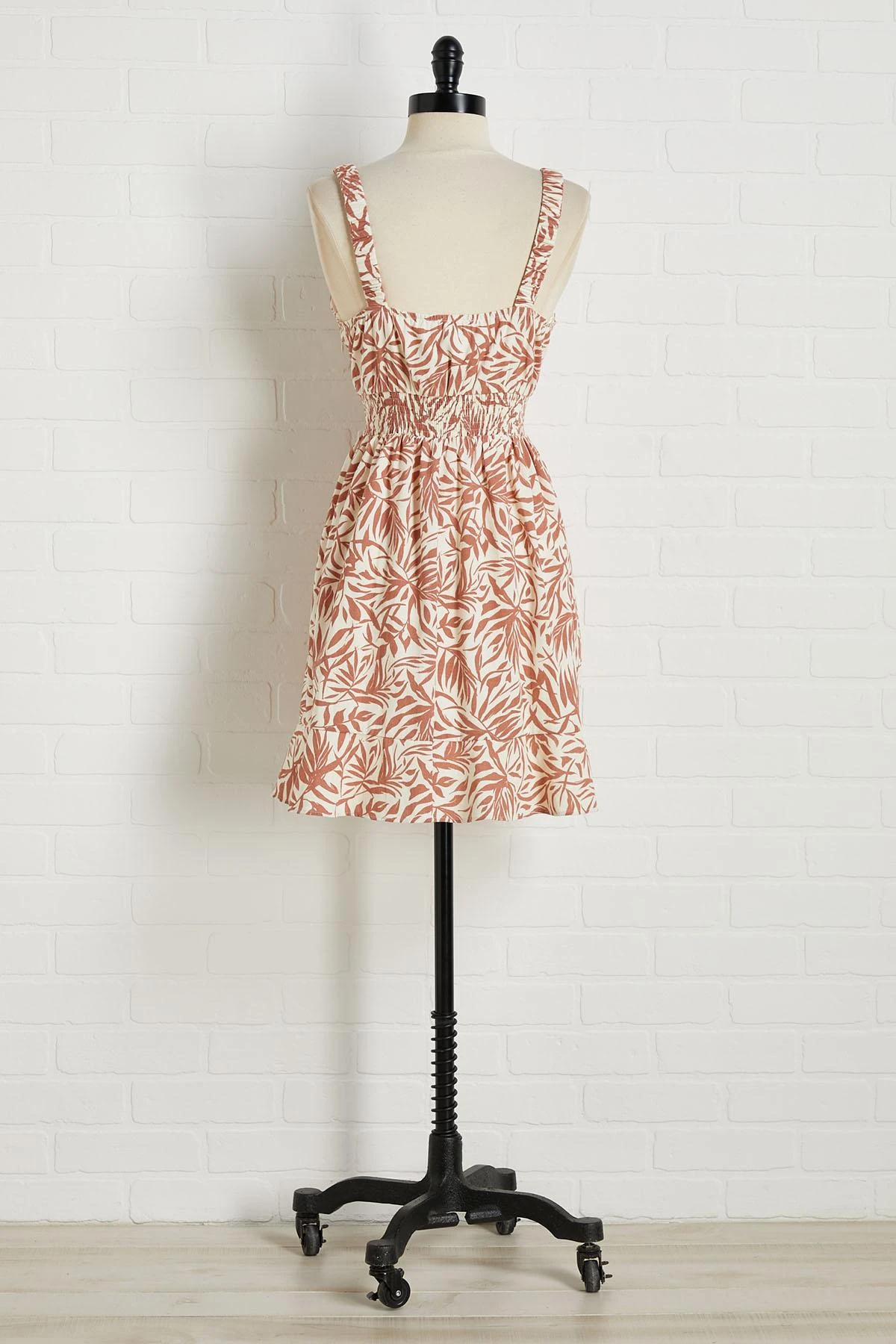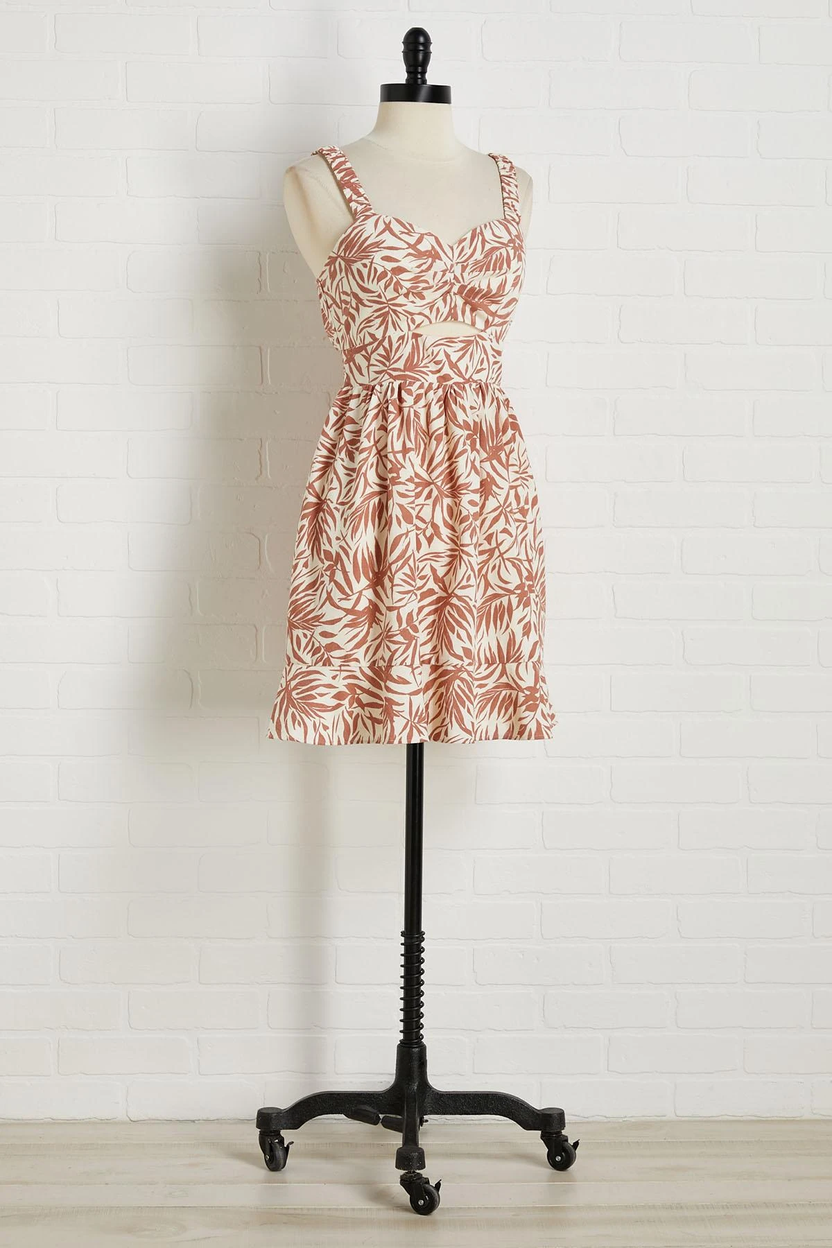 Somewhere under the sun is where you need to be in this darling style with a cutout accent, linen-blend and neutral, palm print.