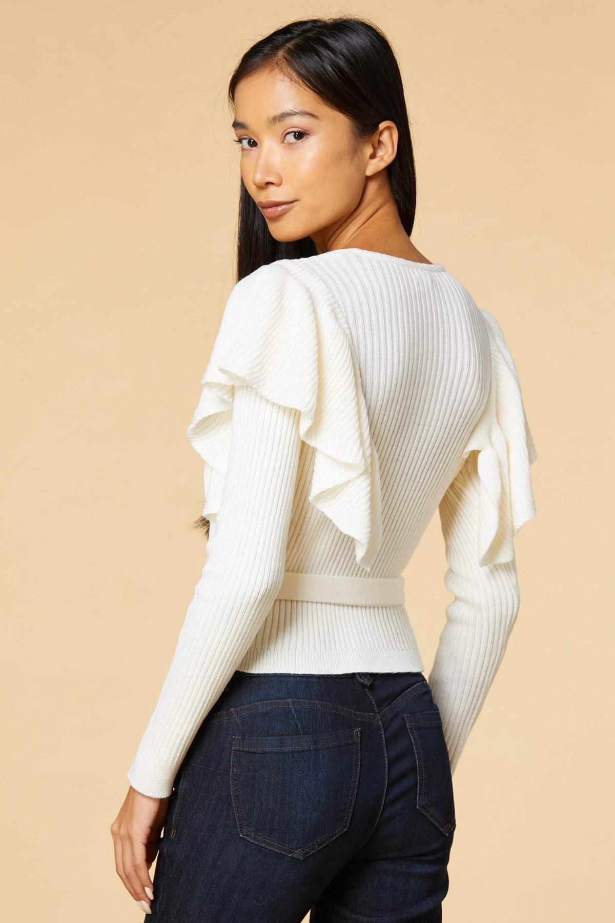 Looking for a style that doubles as trendy and cozy? Look no further. A wrap style with tiered ruffle sleeves and a tie waist create a sweater so stylish you’ll never want to unwrap.