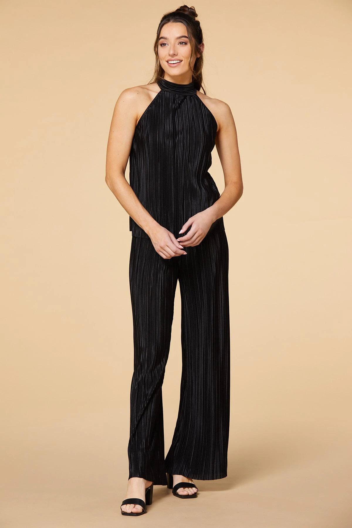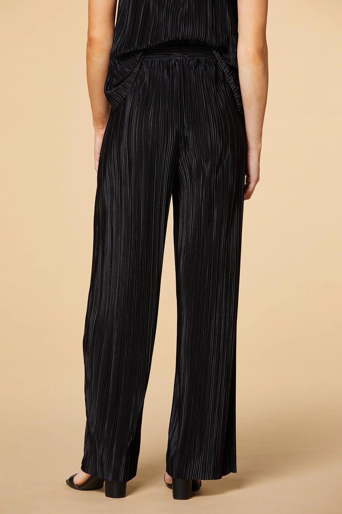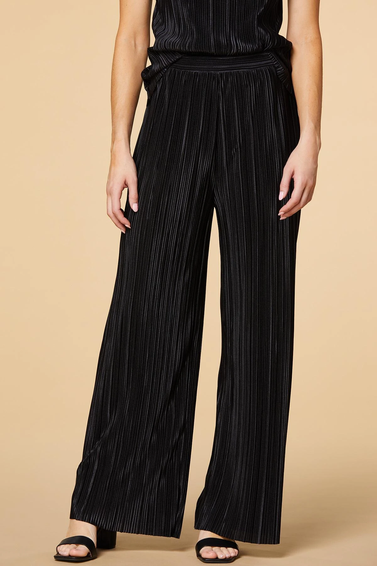 A shiny black hue dresses up this flowy, wide leg style with a pleated design and comfortable-stretch fit. Pair with our matching top for a standout look that’s going places.